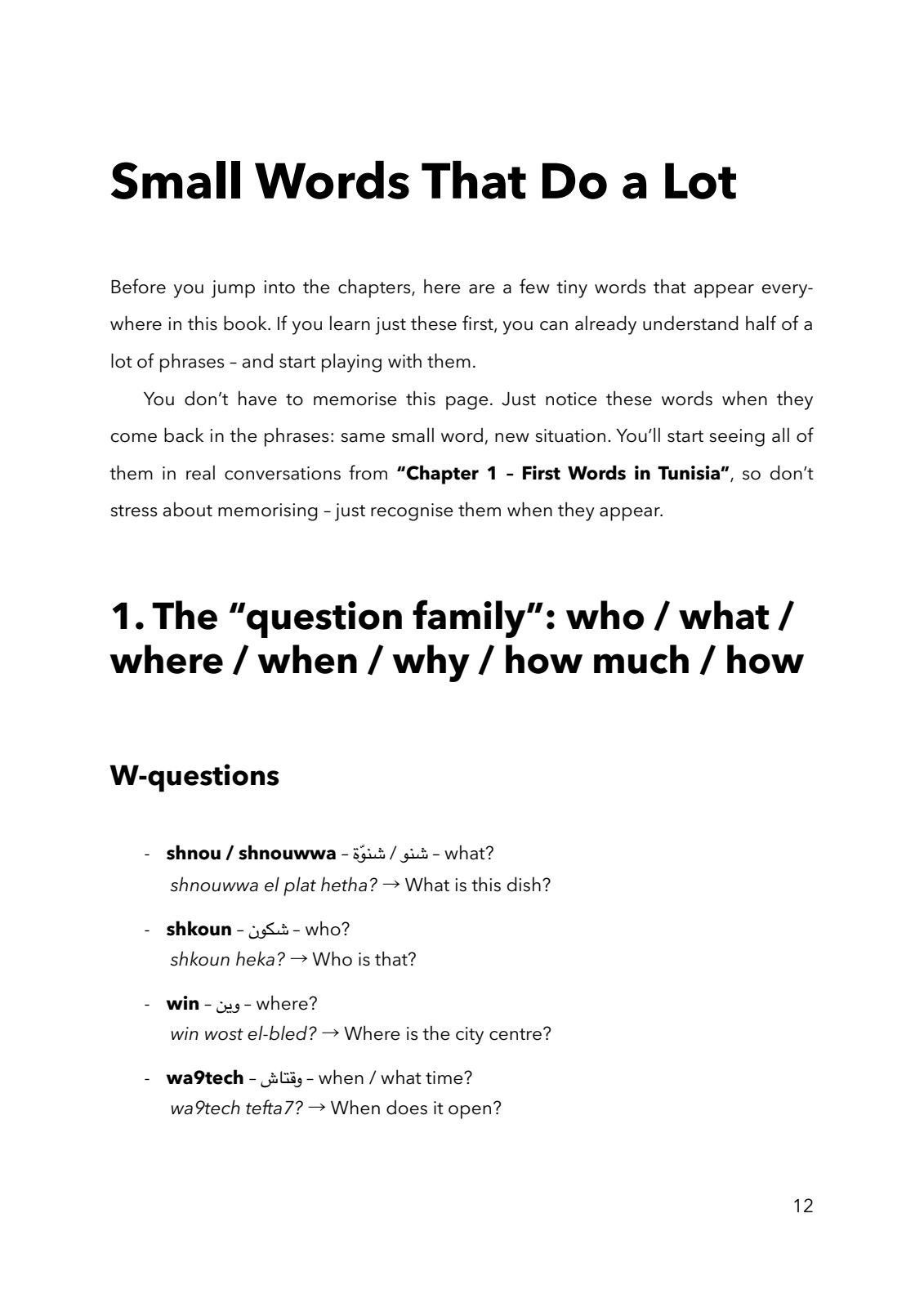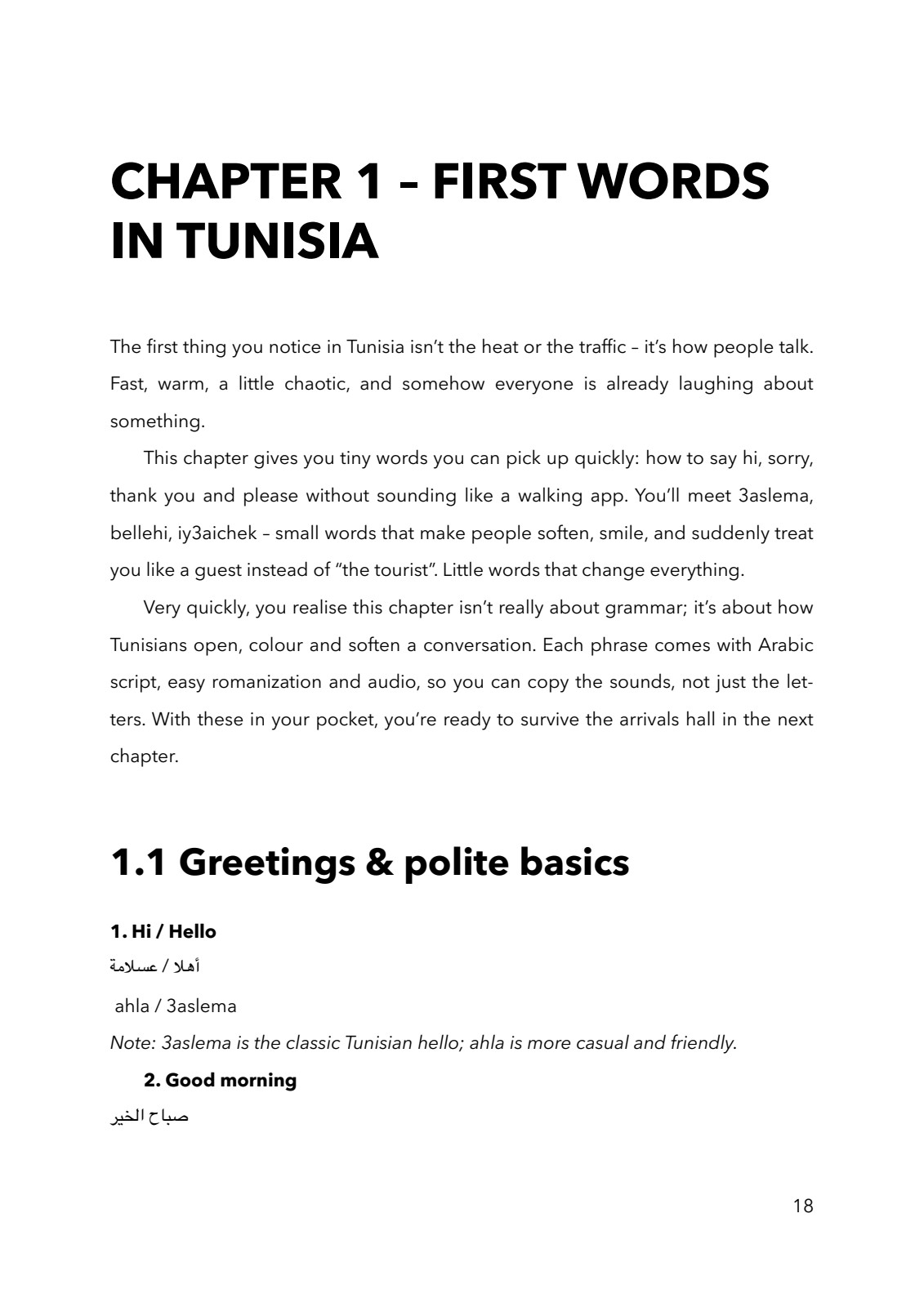 The chapters follow a natural trip through Tunisia — from first words and arrivals to cafés, souks, family life, emergencies, and real everyday expressions.